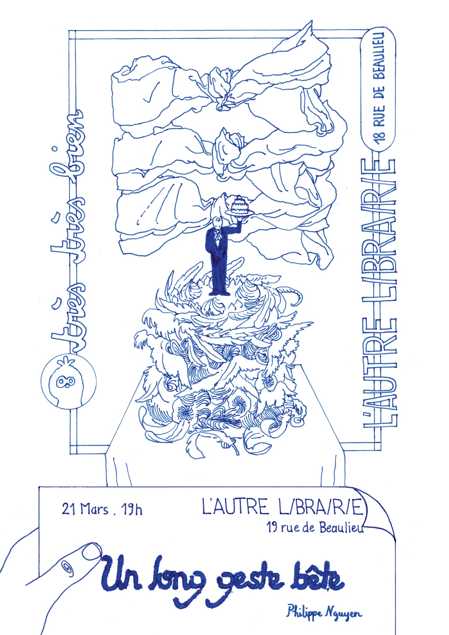 Samedi 21 mars à 19 heures aura lieu à L’Autre librairie le lancement du fanzine Un long geste bête de Philippe Nguyen par la maison de micro-édition Très Très Bien. Cet événement sera accompagné d’une dégustation de délicieux gâteaux à l’apparence surprenante.